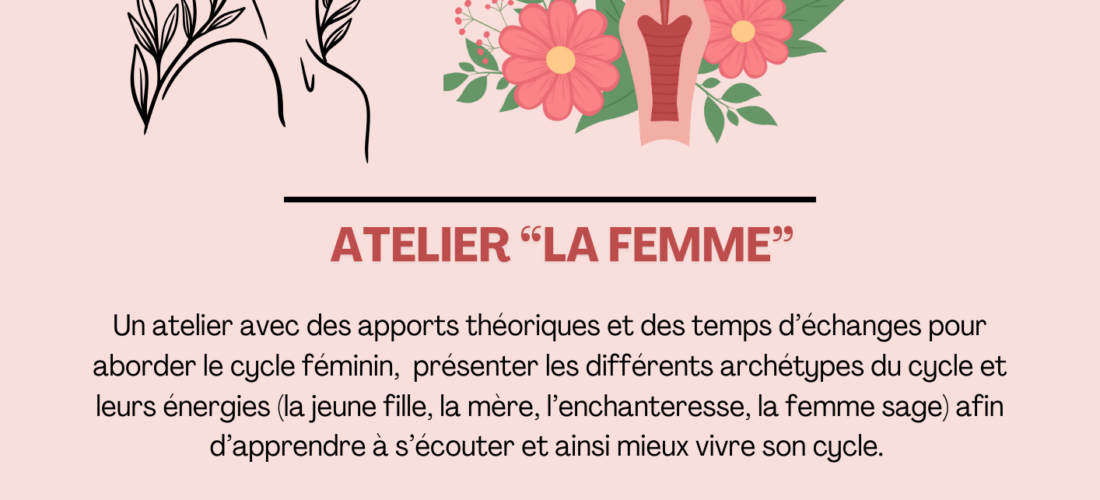 Un atelier pour (re)découvrir notre fonctionnement de femme soumise à des cycles : le fonctionnement du cycle féminin, les archétypes selon les moments du cycle, et leurs énergies. Vendredi 9 mai de 14h à 17h. ...